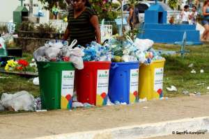 Uitpuilende vuilnisbakken op de begraafplaats.