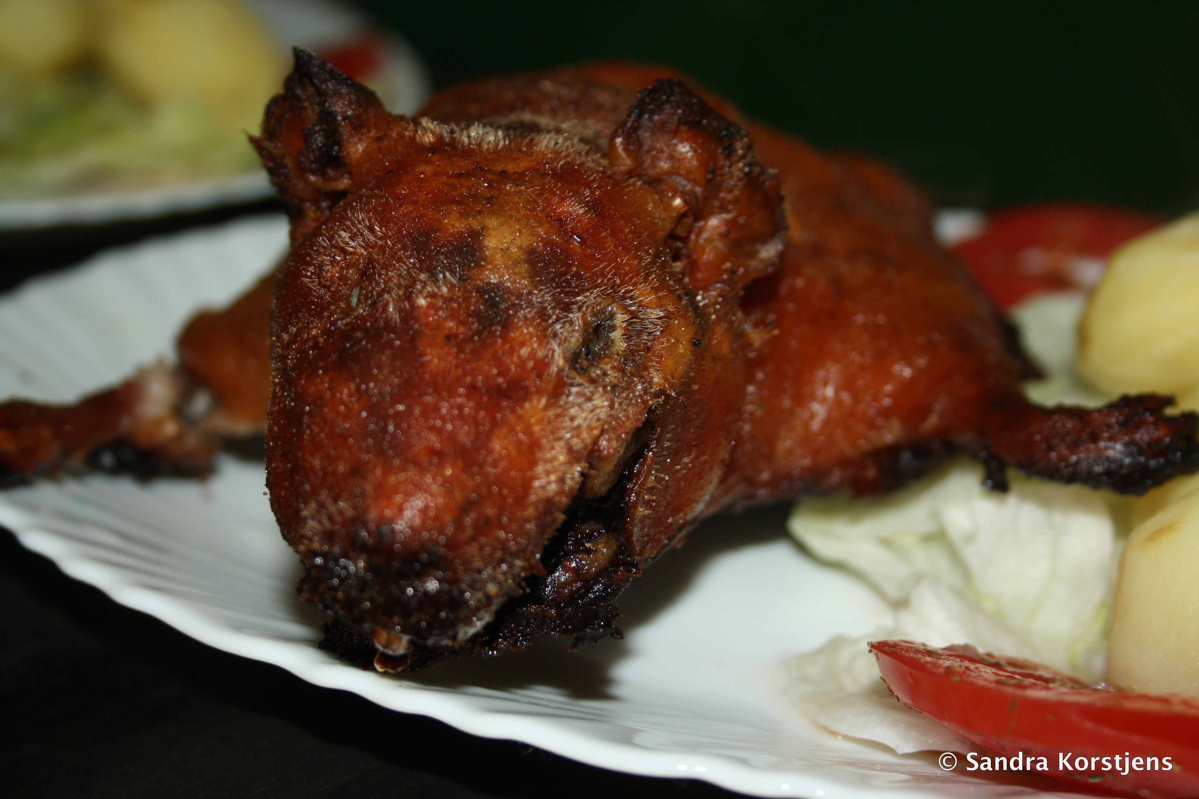 Als ik het restaurant binnen stap ruik ik al de geur van geroosterd vlees. De restauranteigenaar, en tevens kok, vertelt me dat hij de cavia’s de vorige avond heeft ontveld en de hele nacht gemarineerd. Vervolgens gingen de beestjes 1,5 uur in de oven. Hij heeft de twee cavia’s voor ons doormidden gesneden. Ik krijg één van de achterkanten, inclusief pootjes, voor m’n neus. Vanaf de andere kant van de tafel staren de zwartgeblakerde oogjes van de cavia me aan. Ik begin intussen te twijfelen of dit wel zo’n goed idee was. Voorzichtig neem ik een hapje. Maar ik moet zeggen, het is eigenlijk best lekker! Ook mijn tafelgenoten zijn aangenaam verrast, hoewel het wel een gedoe is om het vlees van de cavia te peuteren. “Gewoon je handen gebruiken”, raadt de restauranteigenaar ons aan. Na een kwartiertje kluiven heb ik genoeg gehad. De hoofden en pootjes hebben we niet aangeraakt, maar verder heeft het ons prima gesmaakt.