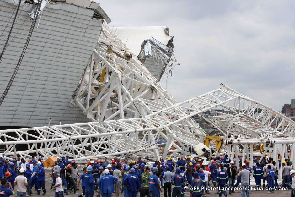 Afgelopen woensdag was het weer zover. Tegenslag nummer ik-weet-niet-hoeveel in de aanloop naar het WK in Brazilië. Op de bouwplaats van het nieuwe WK-stadion in São Paulo waar op 12 juni de openingswedstrijd gespeeld moet worden, bezweek een kraan onder het gewicht van een grote metalen structuur. Die kwam vervolgens bovenop het stadion in aanbouw terecht. Twee bouwvakkers kwamen om het leven en de bouw van het stadion heeft een flinke vertraging opgelopen.