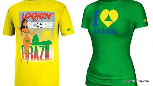 Op het ene T-shirt staat de tekst ‘Lookin’ to score Brazil‘ met daarbij een afbeelding van een dame in bikini. Op het andere T-shirt staat ‘I love Brazil’, waarbij het hartje dat het woord ‘love’ moet uitbeelden vooral doet denken aan twee billen met een tangaslipje.